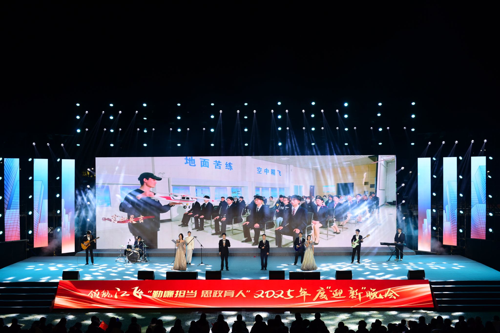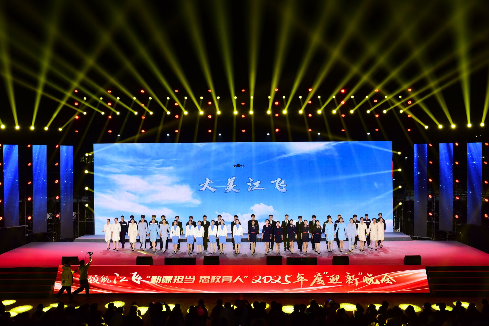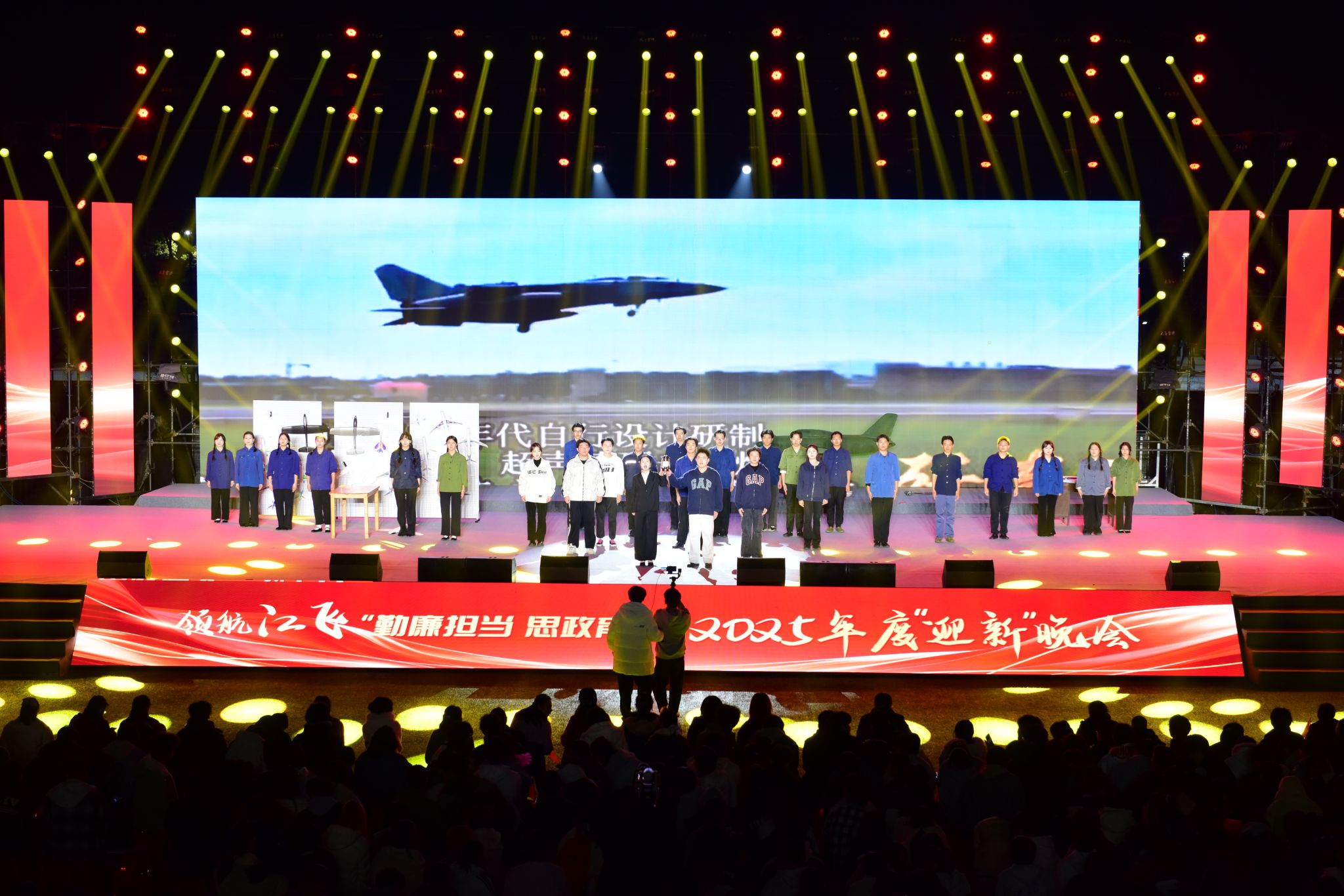 晚会期间,校领导与各二级学院党总支书记分别为“国家奖学金”“国家励志奖学金”获奖学生代表颁奖,表彰先进,树立青春榜样。随后,风尚秀《大美江飞》以创意编排展现校园风采,乐器演奏《国韵雅乐》勾勒出国风雅韵,青春舞《红日》涌动蓬勃朝气,话剧《红飞之路》生动展现了航空报国情怀。最终,晚会在气势磅礴的大型歌舞《领航》中圆满落幕。