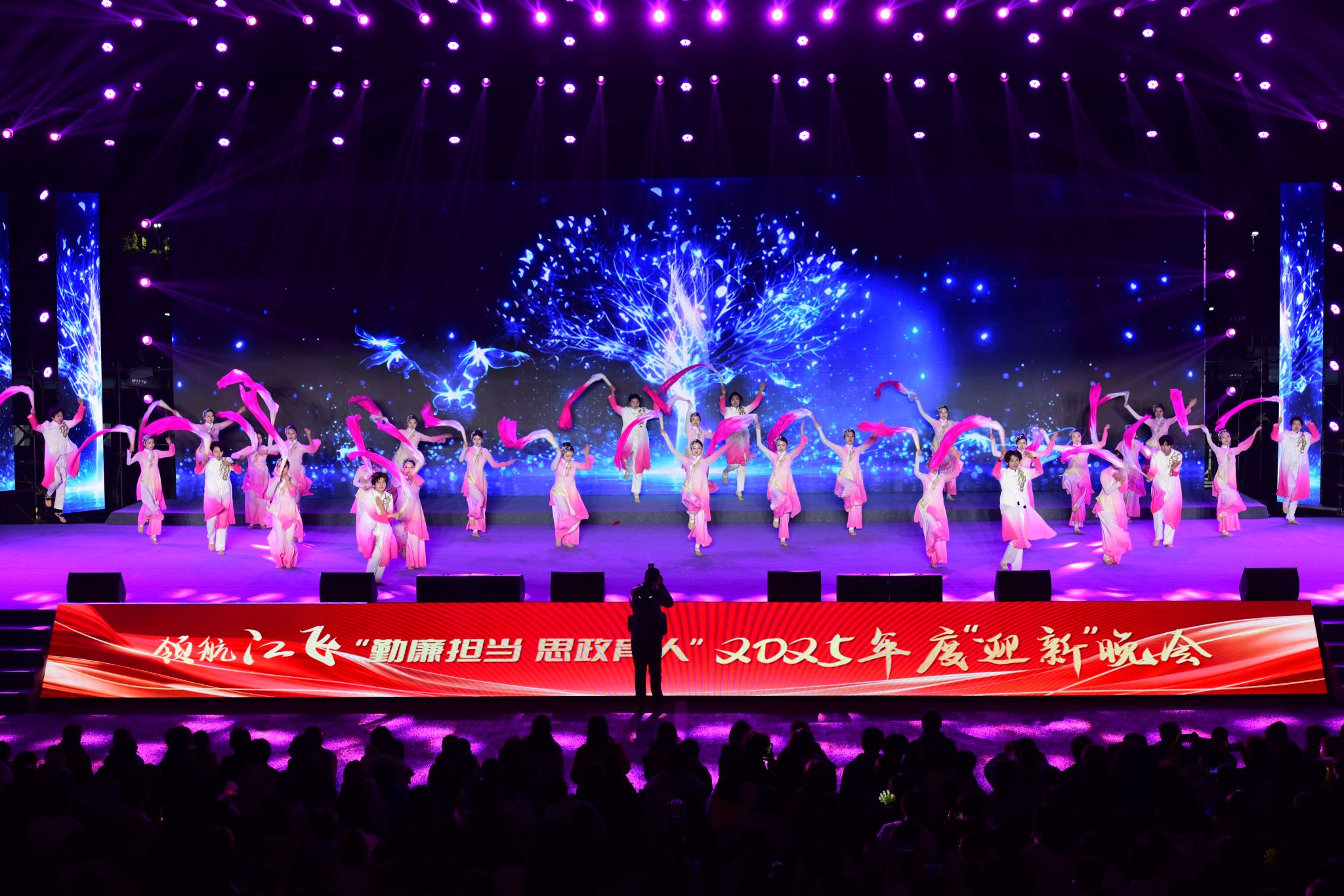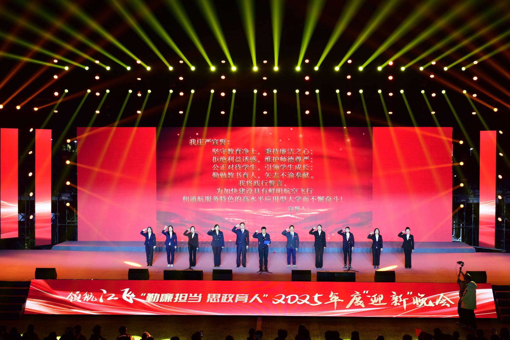 无人机表演率先点燃全场热情。晚会在激昂的《强军战歌》大合唱中正式开幕。诗朗诵《江飞正青春》抒发了对学校的深厚情感与美好祝愿,歌舞《人民的名义》诠释了立德树人的初心使命。《立足三尺讲台 践行教育家精神》以铮铮誓言表达了对教育事业的坚守。快板《廉政花开结硕果》以通俗活泼的形式传递勤廉理念,原创歌曲《爱如莫言》用旋律诉说着师恩情深。情景剧《站在历史的画廊回望你——况钟》贯通古今,激发奋进力量,舞蹈《桃李芬芳》《幸福江飞飞起来》则以优美舞姿展现艺术魅力。