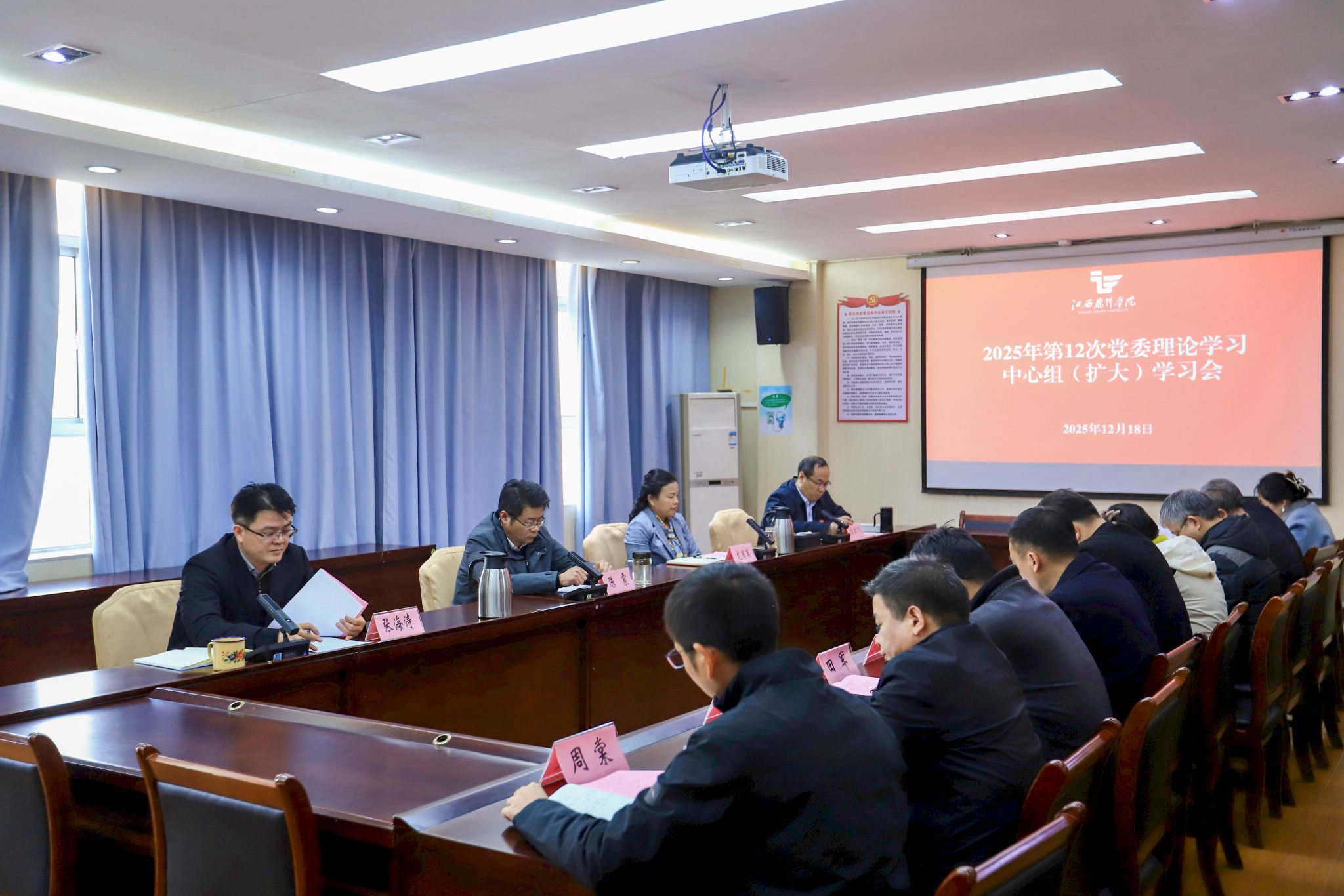 12月18日,学校召开2025年第12次党委理论学习中心组(扩大)学习会,深入学习《习近平谈治国理政》第五卷。党委书记陈震主持学习会并讲话,校长龙国英参加学习,校党委副书记张海涛,党委委员、副校长郭军华作中心发言。