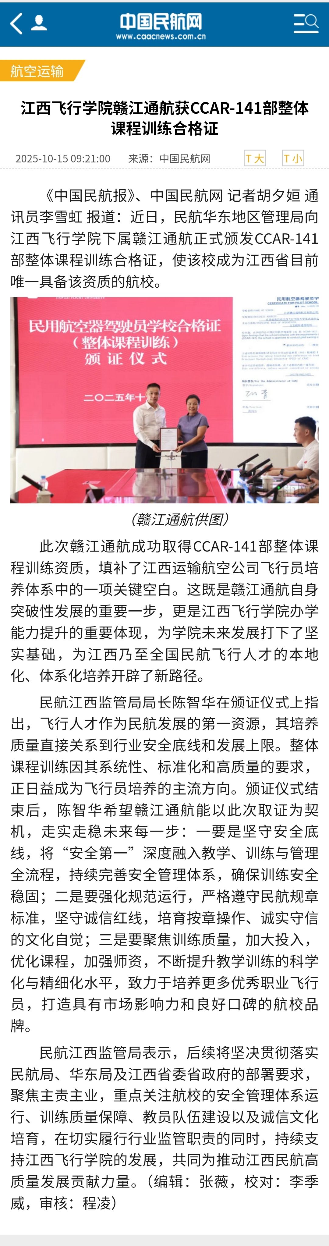 中国民航网:中国民航网报道,江西飞行学院赣江通航获CCAR-141部整体课程训练合格证