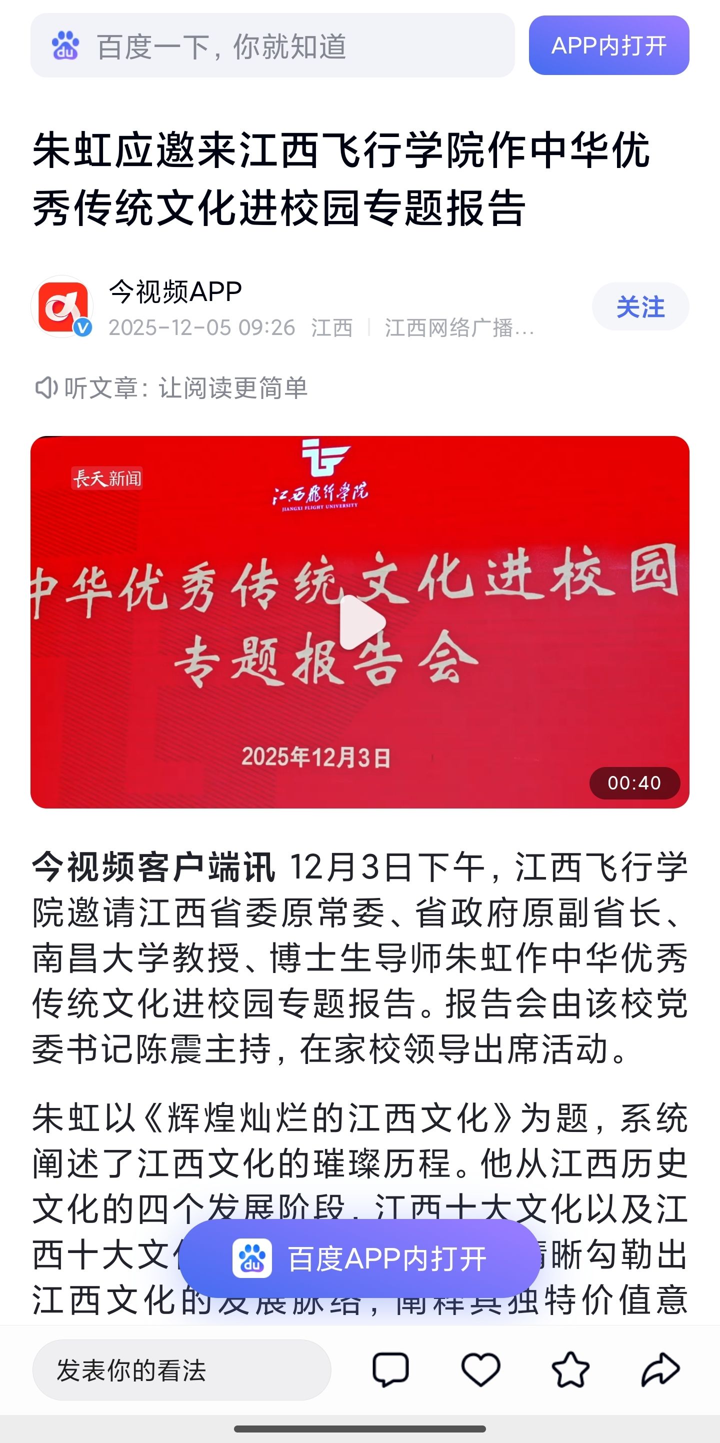 近日,百度报道,朱虹应邀来江西飞行学院作中华优秀传统文化进校园专题报告详情如下: