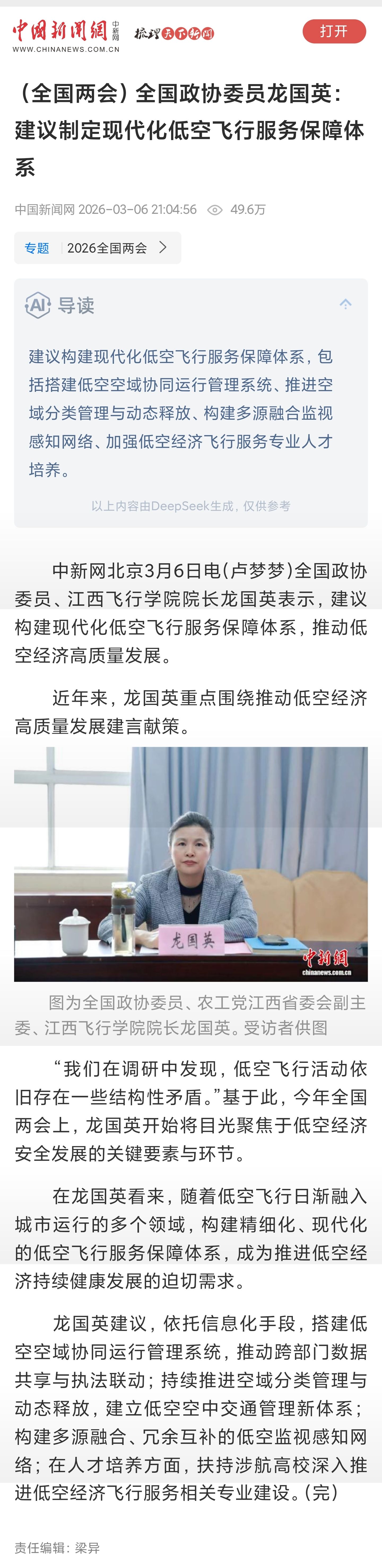 中国新闻网:(全国两会)全国政协委员龙国英:建议制定现代化低空飞行服务保障体系
