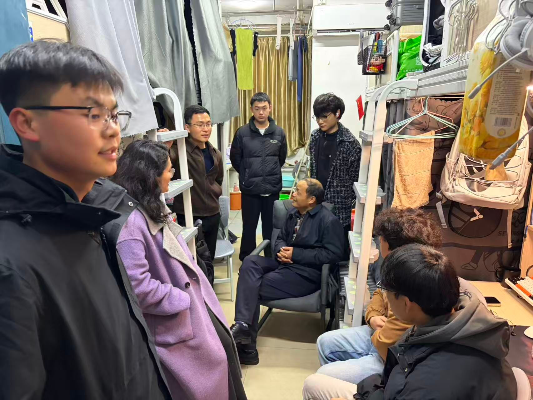 当晚,飞行技术学院党总支书记杨豪、党总支副书记程斌带领辅导员们走进学生宿舍开展了一场温馨的走访慰问活动。宿舍里,师生围坐一起,亲切地拉起家常,畅谈假期生活和新学期规划等,倡导同学们积极参加各类实践活动,坚持体育锻炼,全面提升自身综合素质。